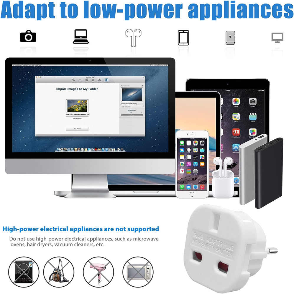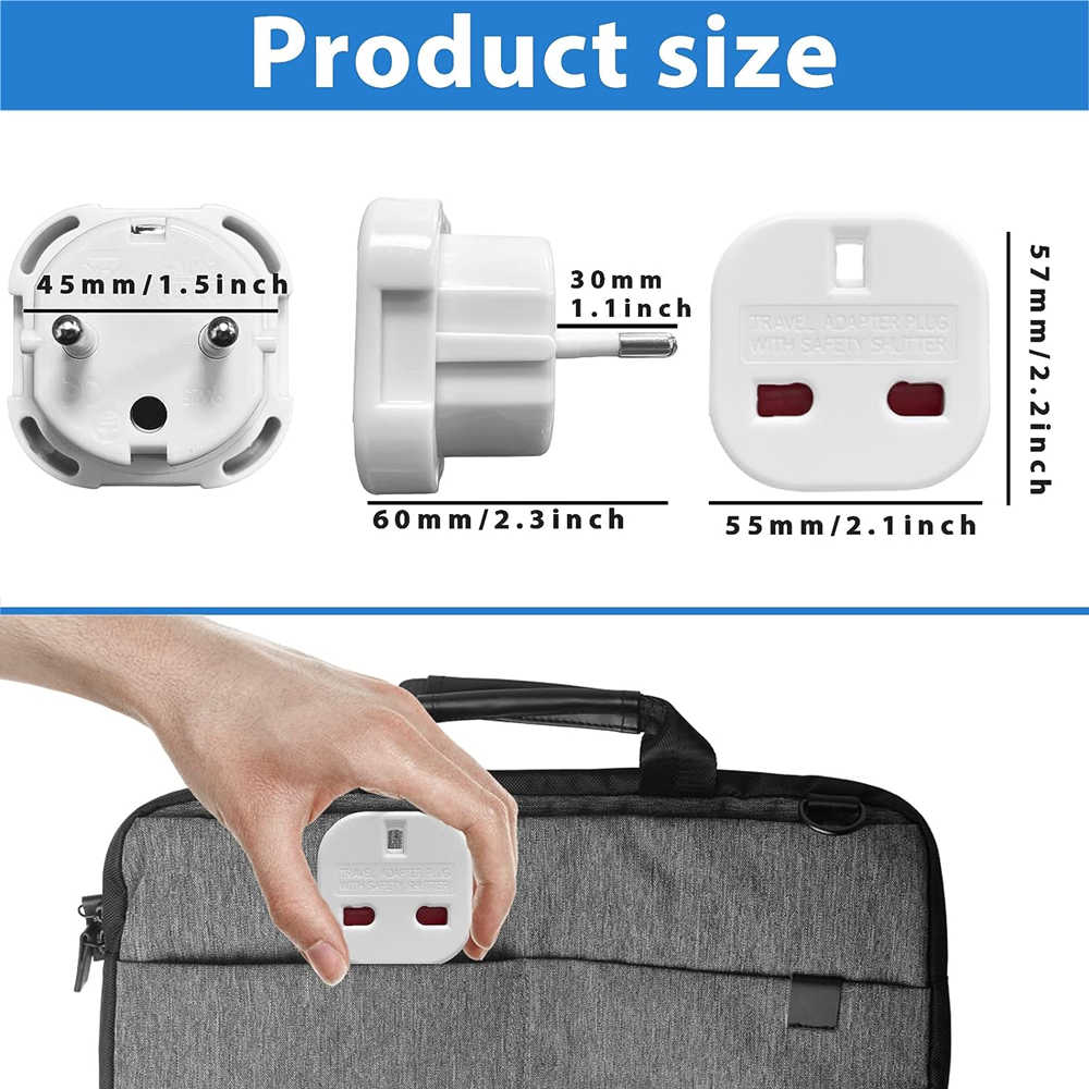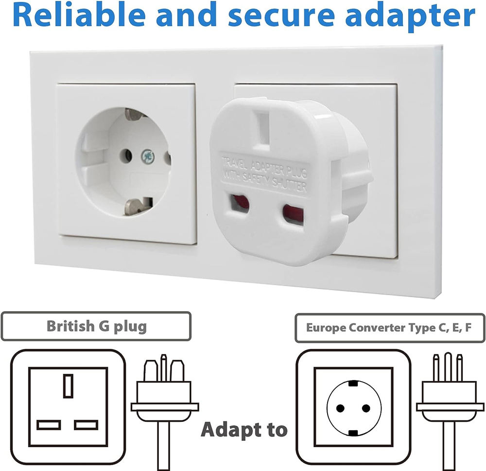 2X Pack of travel plug UK to EU travel adaptors. Certified RoHs and CE approved product. Conforms to British Safety Standards. Suitable for 100 - 240v. These adapters have swivel pins, you need to turn the pins to be able to work in DE and IT. If you have any after-sales questions, please feel free to contact us